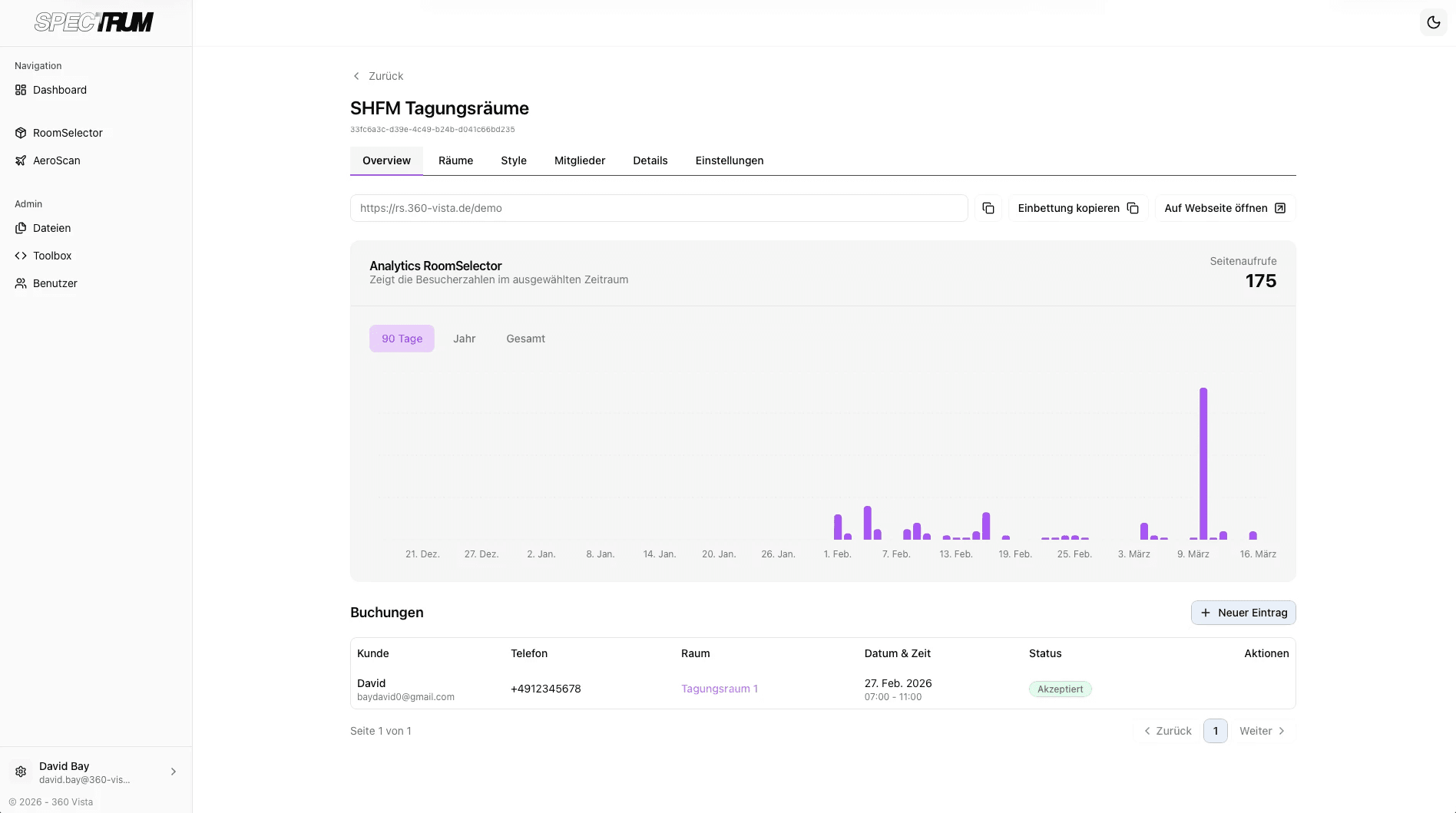 Sehen Sie in Echtzeit, wie Ihr RoomSelector genutzt wird. Buchungshistorie, Konversionen und Besuchertrends auf einen Blick.